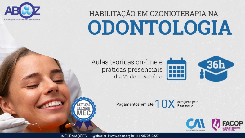 *No Brasil, a prática da Ozonioterapia na Odontologia foi regulamentada pelo Conselho Federal de Odontologia através da resolução CFO-166/2015. Para exercer a técnica, o profissional deve realizar o curso de Habilitação em Ozonioterapia devidamente reconhecido pelo MEC, com carga horária de 32 horas/aula.